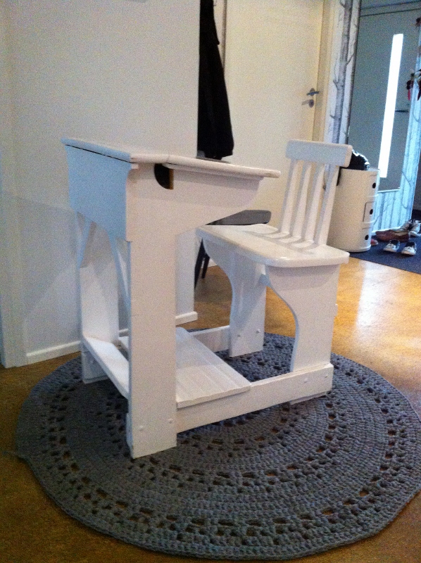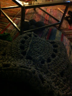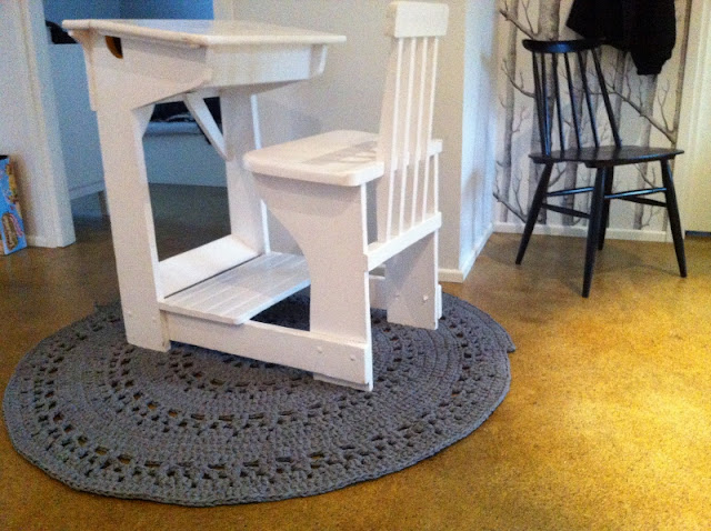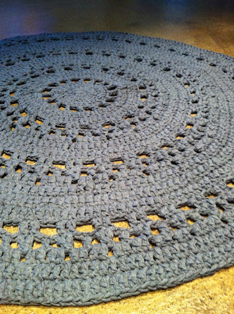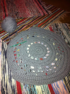 Olen virkannut pyöreää mattoa. Aluksi käytössä oli koukku nro 8 ja aikani virkattuani huomasin että jälki oli aivan liian tiukkaa. Olin ohjeen mitasta noin 30 cm päässä. Vaihdoin sitten koukkuun 10 ja nyt loppui kude kesken.. Kaksi ja puoli riviä jäi uupumaan. Lähetin äidille jo osto-ohjeet..