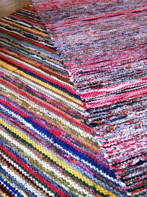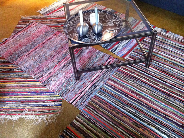 Ekassa kuvassa näkyy minun tämän hetkinen olohuoneen matto. Se on koottu neljästä vanhasta räsymatosta, jotka sain mammaltani. Yhden maton puolitin kahdeksi matoksi, muuten matot ovat yksilöllisiä. Tämä on minusta kiva piriste, vaikka punaisesta en niinkään välitä.