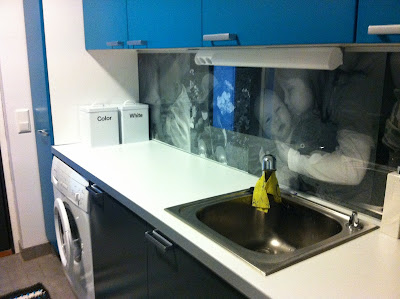 Meillä on välitilan laatoituksen sijaan seinään tulostettu pari suurta kuvaa omista lapsista ja päälle on laitettu lasi. Työvalo häiritsee epämiellyttävästi ja tarkoitus on vaihtaa se joku päivä ledilistaan.
