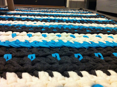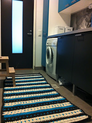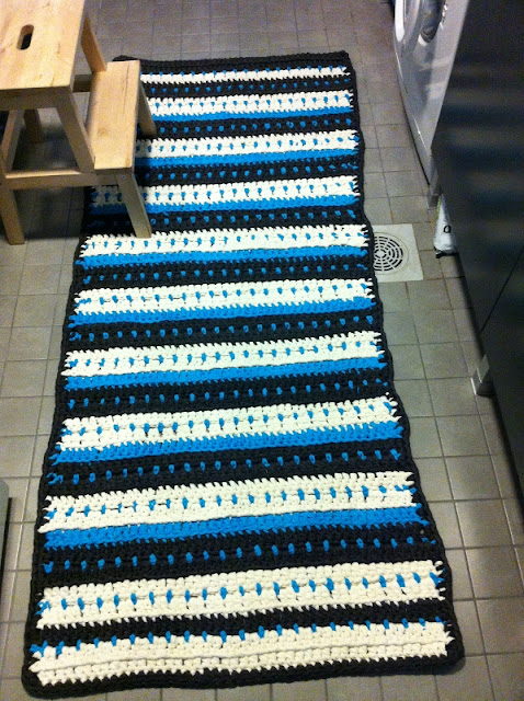 Matto on virkattu pylväillä. Turkoosit pilkut syntyivät siten että väliin virkkasin: *ks, 2 kjs, ks*.