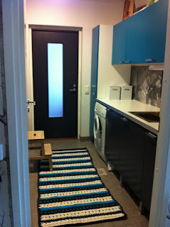 Yläkaapit on ihanat turkoosit ja alakaapit sekä toisella sivustalla olevat pitkät kaapit tumman harmaita. Työtaso taas valkoinen. Kas kummaa, sopivat värit uudelle matolle.