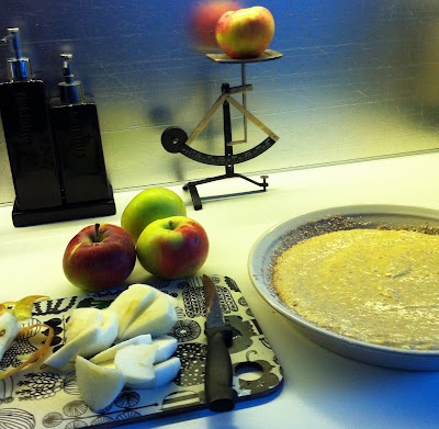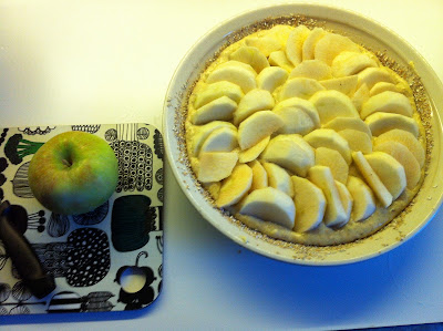 Sekoita kuivat aineet ja sekoita muut ainekset joukkoon. Levitä voidellulle leseillä leivitetylle piirakkavuoalle. Viipaloi päälle omenaa ohuina viipaleina ja ripottele 1 tl kanelia päälle (mikä mulla unohtui pois). Piirakan päälle ripottele vielä Muruseos (50g margariinia sulatettuna, joukkoon sekoitetaan 3/4dl sokeria ja 1,5 dl Kuidukas Leseseosta) sekoitetaan piirakan päälle.