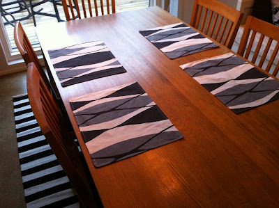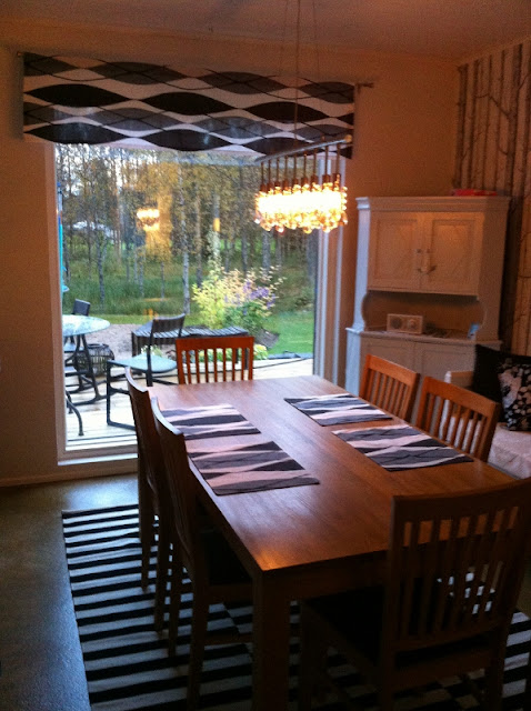 Sain jonku ihmeinspiksen ja tuunasin ruokailutilaan verhot ja ruokapöydälle pöytätabletit. Alunperin kangas on ollut pitkässä ja leveässä verhossa, jossa kuvio oli pystyssä. Nyt laitoin kuvion vaakaan ja minusta tuli aika kiva.