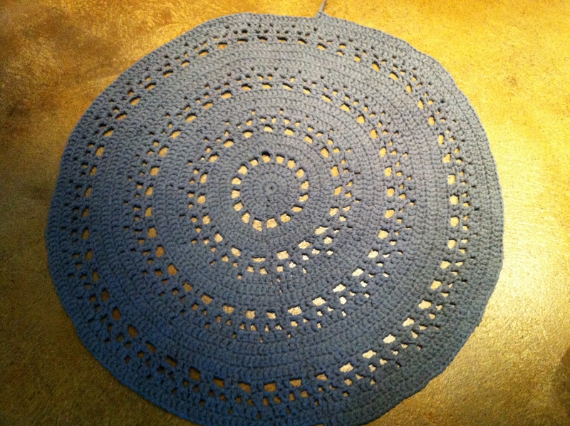 Olen virkannut pyöreää mattoa. Aluksi käytössä oli koukku nro 8 ja aikani virkattuani huomasin että jälki oli aivan liian tiukkaa. Olin ohjeen mitasta noin 30 cm päässä. Vaihdoin sitten koukkuun 10 ja nyt loppui kude kesken.. Kaksi ja puoli riviä jäi uupumaan. Lähetin äidille jo osto-ohjeet..
